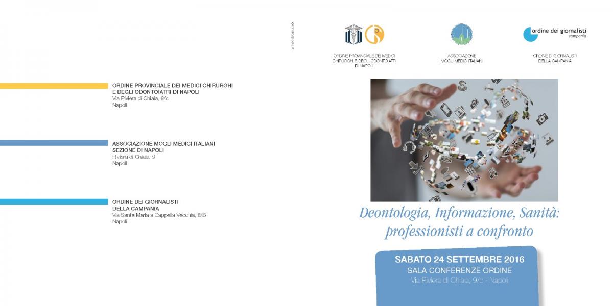 NAPOLI- CONFERENZA- Deontologia, Informazione, Sanità: professionisti a confrontoCONFERENZA- Deontologia, Informazione, Sanità: professionisti a confronto 24 Settembre, ore 8.30 Sala conferenze Ordine dei Medici via Riviera di Chiaia, 9/c Napoli